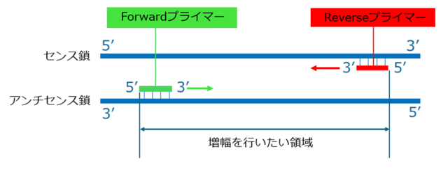 プライマーは、標的DNAの上流側(5’側)でセンス鎖を、下流側(3’側)でアンチセンス鎖を選びます。