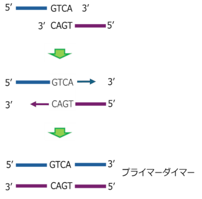 - 特に3’末端の3 base以上の相補的配列を避けることで、プライマーダイマーの形成を防ぎます。